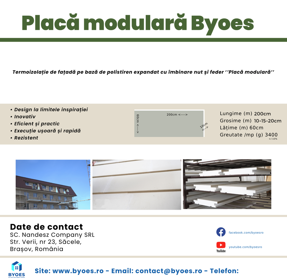 Placa modulară de la BYOES din polistiren acoperit cu strat de protecție se potrivește oricărui tip de fațadă. Placa modulară este estetică și practică, astfel oferă posibilități variate de a genera efecte vizuale deosebite.